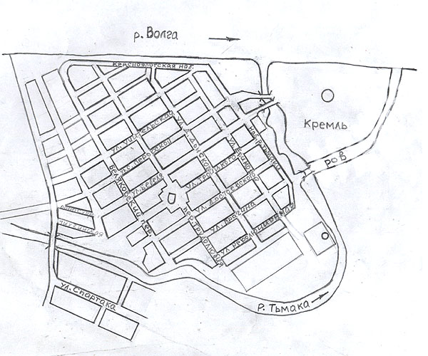 ЗАТЬМАЧЬЕ Жили ремесленники – большенство занималось кузнечным делом, литейным. Было 5 слободок Выше по течению Тьмаки были слободки ловчего пути и псарская. В Затьмачье находился Татарский гостиный двор, где останавливались восточные купцы. Возле церкви Николы на Зверинце находился княжеский зверинец. До пожара 1763 года улицы располагались вдоль рек Волги и Тьмаки. В средней части было много территорий, занятых под пашни. План застройки Затьмачья был создан в 1777 году. Главный парадный фасад, набережная Тьмаки, был обращен к Кремлю. Там велось строительство каменных домов, принадлежащих местным комерсантам и церковным причтам.